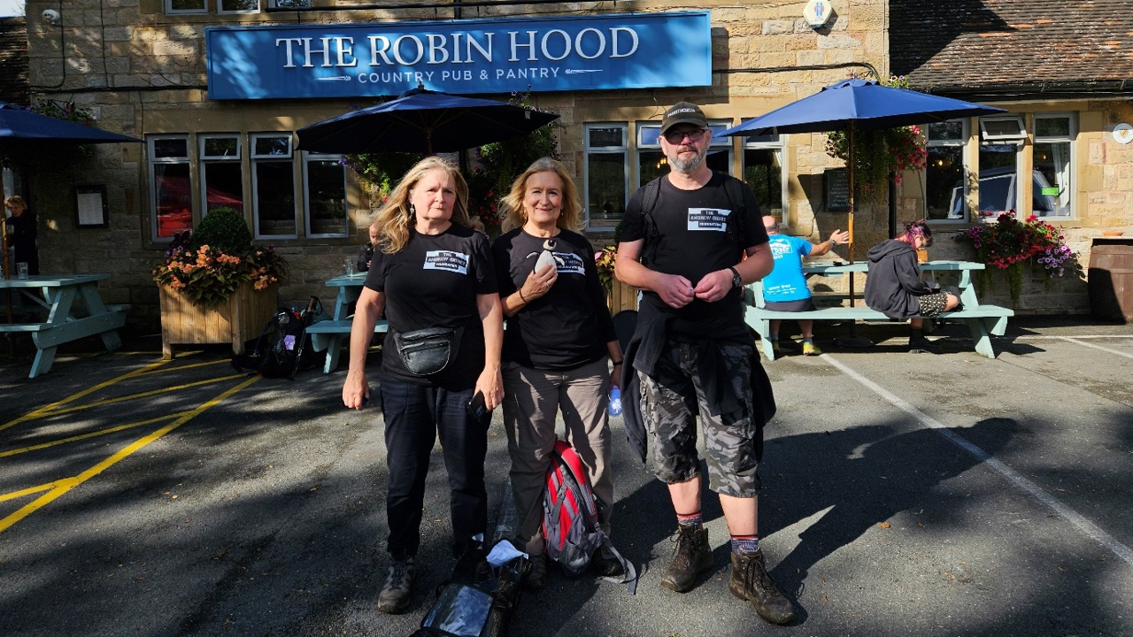 Kevin took Andrew’s soft toy penguin for company for the first 4 Edges. At the 13 mile point, with another 5 Edges still to go, he was joined by Andrew's Mum Jude and Aunt Alison. The three plus penguin completed the route together in just over 7 hours for the full 20 miles, and once again enjoyed a well-earned drink at the Robin Hood Inn.